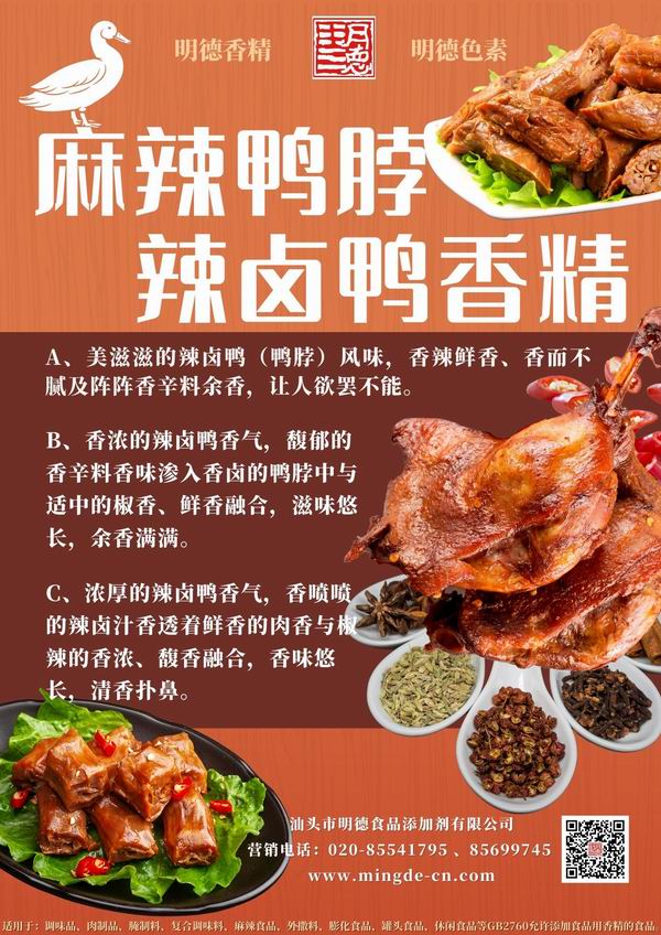 明德食品添加劑 還推出了麻辣鴨脖-辣鹵鴨香精,風(fēng)味香辣鮮香,伴著陣陣香辛料余香,同時椒辣香、鮮香、肉香融合,香味悠長。