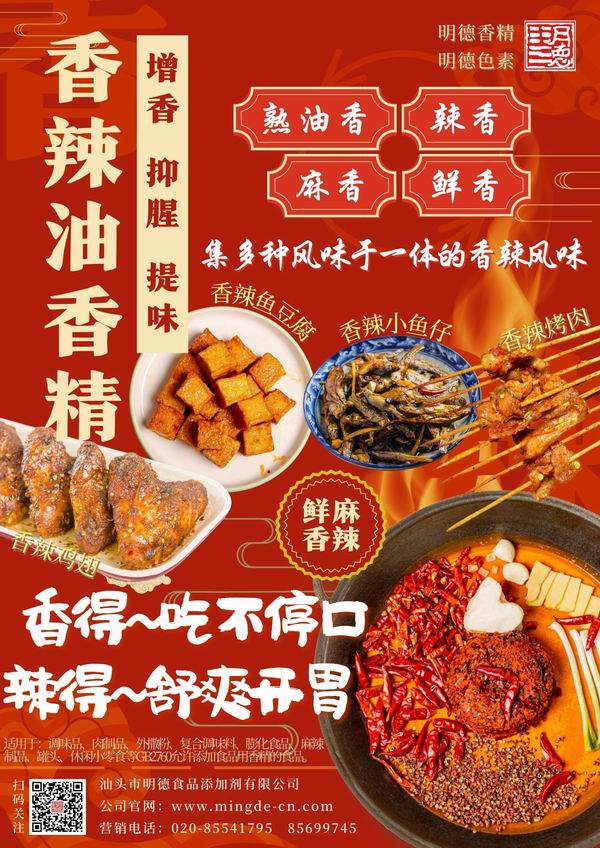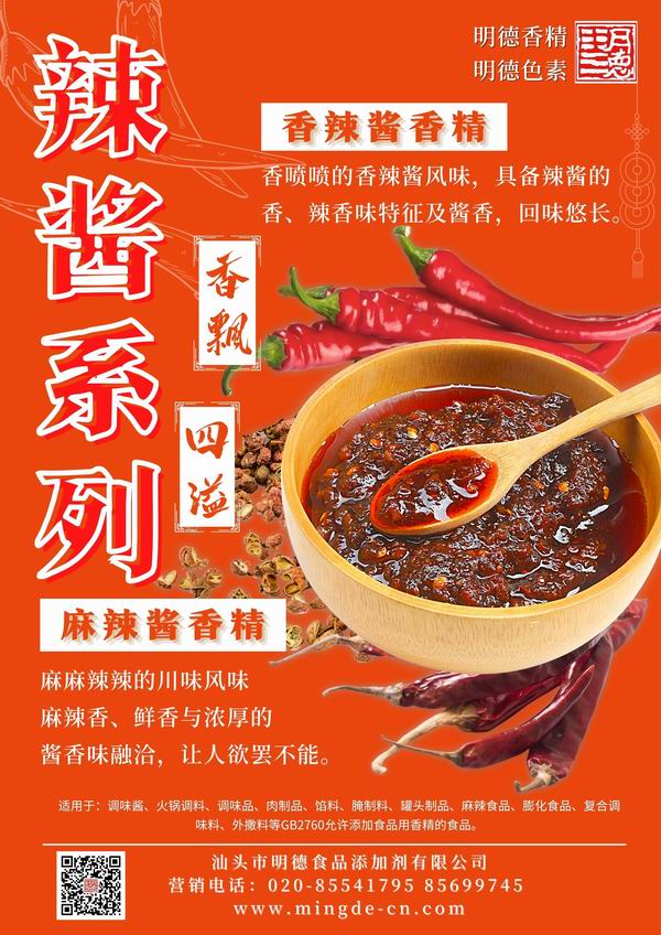 明德 麻辣醬香精、香辣醬香精 香飄四溢。麻麻辣辣的川味麻辣香、鮮香與濃厚的醬香相融合。香噴噴的香辣醬風(fēng)味,具備辣醬的醬香和辣香味交融,回味悠長,令人垂涎欲滴。